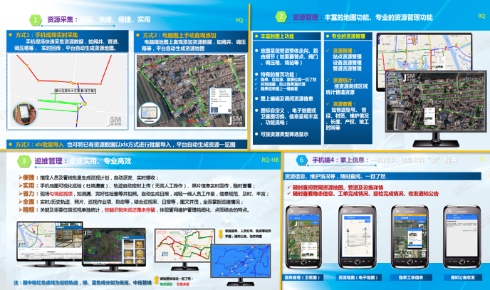 主要功能:城市管网资源普查、管道及公共设施巡检、隐患上报及处理、现场监护等提供了基于智能手机、互联网的一体化、可视化、移动化管理手段。